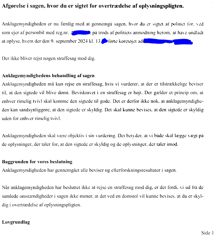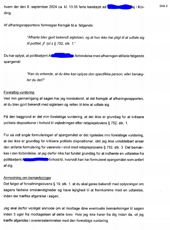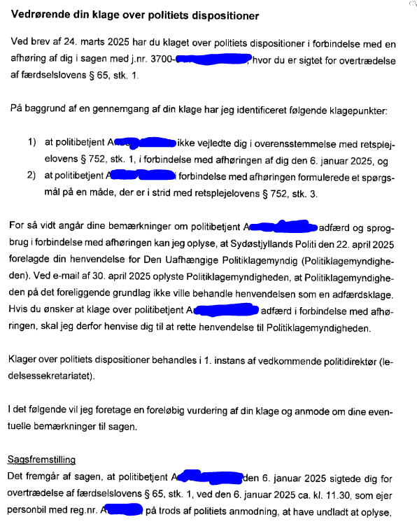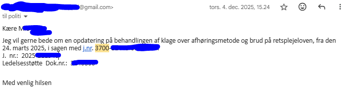 Denne henvendelse skal tillige anses som en formel klage over politiets dispositions- og procesførelse i forbindelse med afhøringen. Jeg anmoder om, at sagen – i det omfang der måtte være tale om generelle eller systematiske forhold – behandles af politiet af egen drift efter gældende forvaltningsretlige principper.